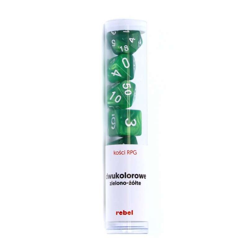 Komplet siedmiu dwukolorowych kości marki Rebel o unikalnym charakterze. Są to jedne z najtrudniejszych w produkcji kości, ponieważ wymagają bardzo uważnego zmieszania dwóch tworzyw o różnym stopniu zabarwienia. Przy produkcji tych kości wszystko może się zdarzyć. Niewłaściwe proporcje, zarówno barwnika, jak i dwóch tworzyw, mogą nieodpowiednio zabarwić daną partię produkcyjną. Tak samo groźne może być zbyt szybkie lub zbyt wolne ich mieszanie.