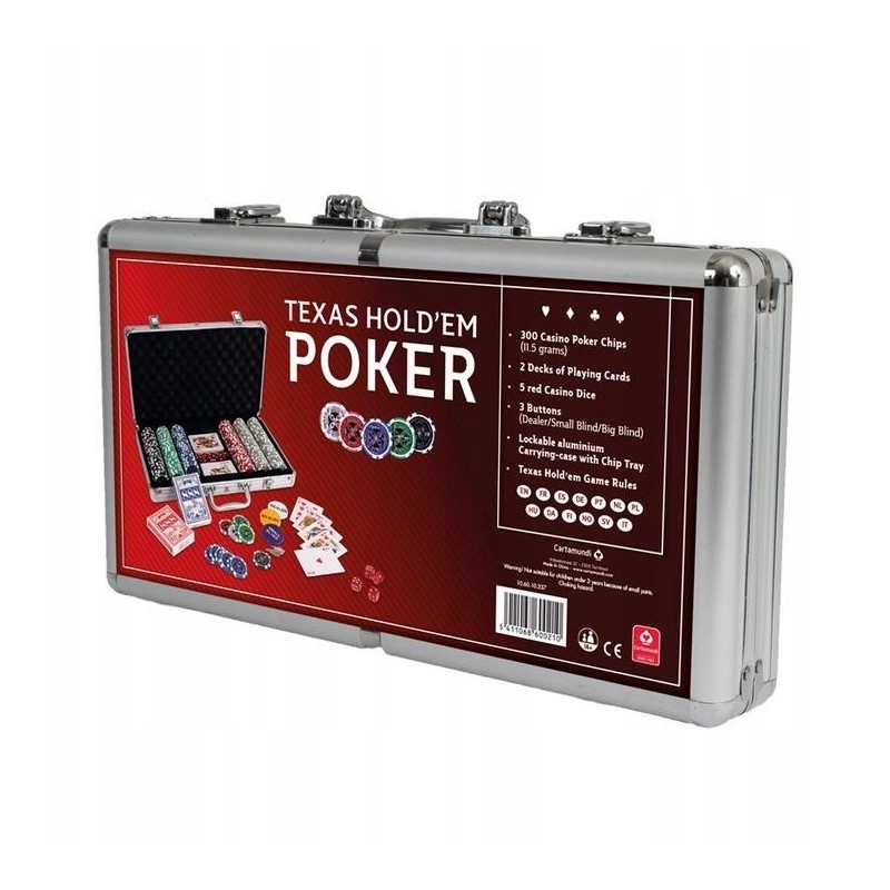 Walizka pokera z zamkiem zawierająca 300 żetonów, 2 zestawy kart, 3 żetony (krupier, mała ciemna (duża ciemna) i tace na żetony). Idealny zestaw do stawiania pierwszych kroków w świecie pokera.