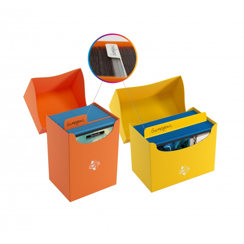 Składane zakładki: prawdopodobnie są to pierwsze przekładki na rynku, które faktycznie dzielą! Zakładki mają większą wysokość, dzięki czemu wystają ze stosu kart, zapewniając dużo lepszą widoczność niż pozostałe przekładki. Elastyczna linia zgięcia gwarantuje, że żadna z kart nie zostanie uszkodzona w trakcie zamykania pudełka. Zakładka zwyczajnie złoży się na bok i rozłoży, gdy pudełko zostanie ponownie otwarte. Dzięki dodatkowej linii zgięcia na boku, zakładka sprawdza się również przy ładowaniu od boku.