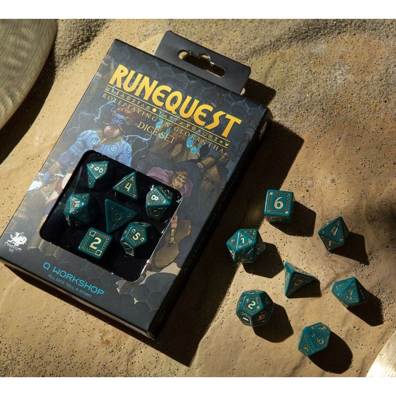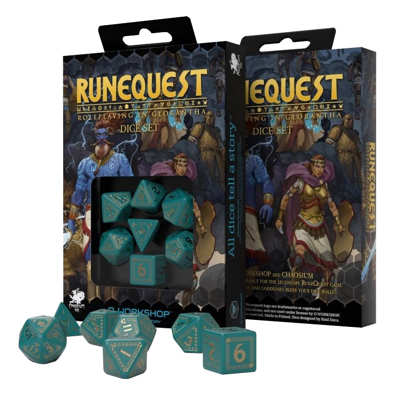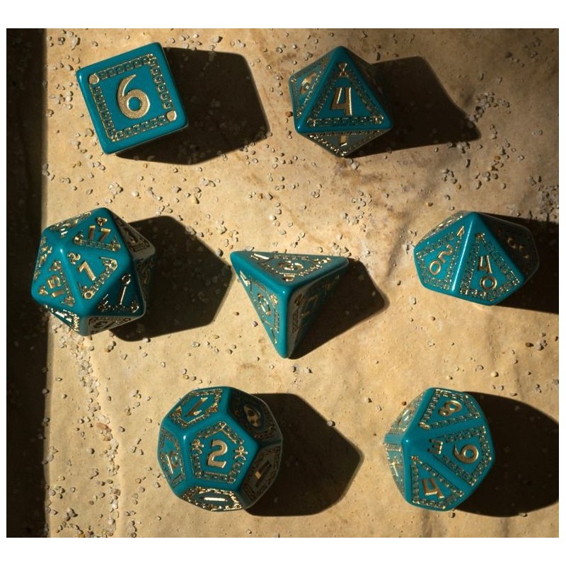 Zestaw Komplet kości RuneQuest RPG: Turkusowo-złoty wykonany jest z najlepszego materiału w kolorze turkusowym i pokryty rozbudowanymi złotymi grawerunkami, które wyglądają jak minojskie wzory.