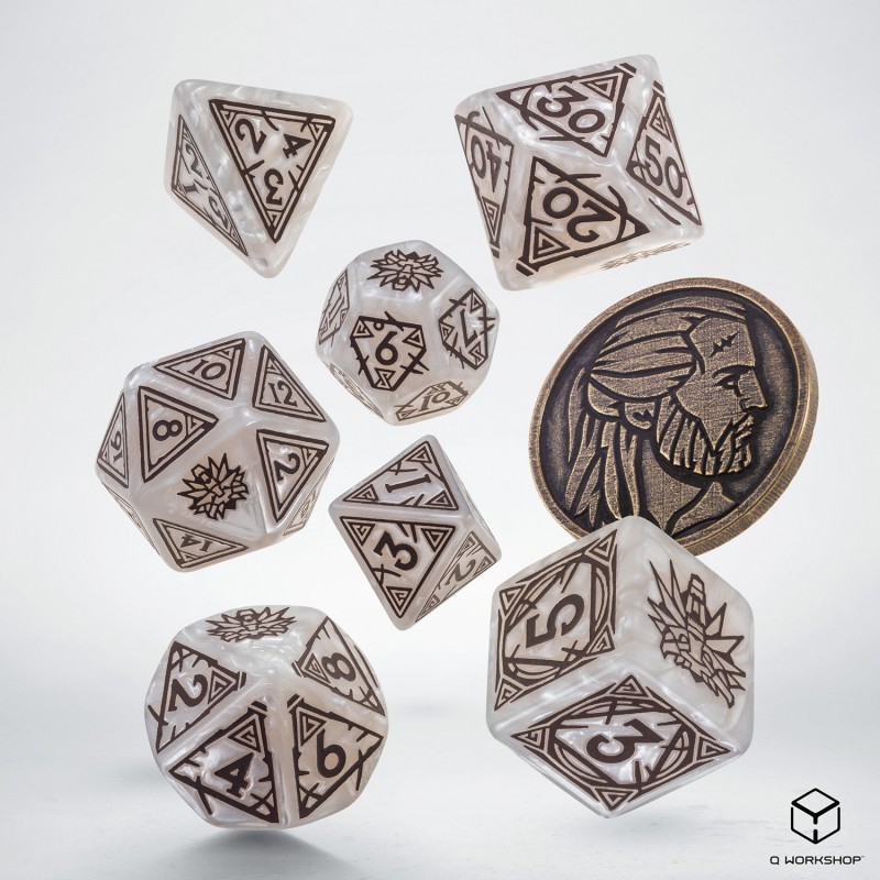 Zestawy kości dedykowane najbardziej kultowym postaciom z uniwersum Wiedźmina!Każdy zestaw został wzbogacony o specjalną monetę z podobizną postaci, na rewersie występuje symbol wilka.