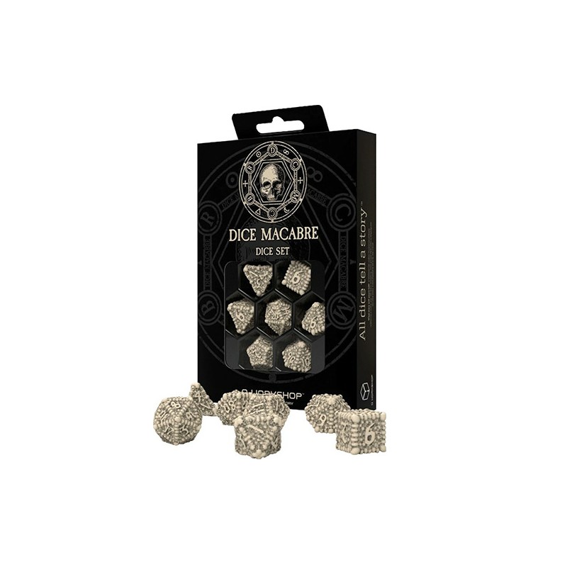 Komplet kości: Macabre to innowacyjny projekt kostek 3D o kształcie brył z dziesiątek maleńkich czaszek. Ten zestaw zawiera 7 kości RPG: D4, D6, D8, D10, D00, D12 i D20.Kości są wykonane z beżowej żywicy z brązowym cieniowaniem dla wyostrzenia detali.