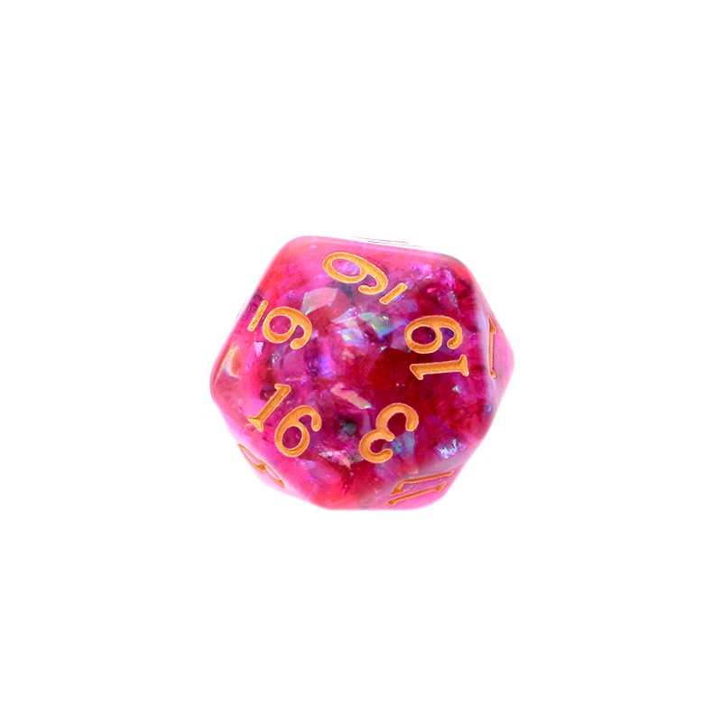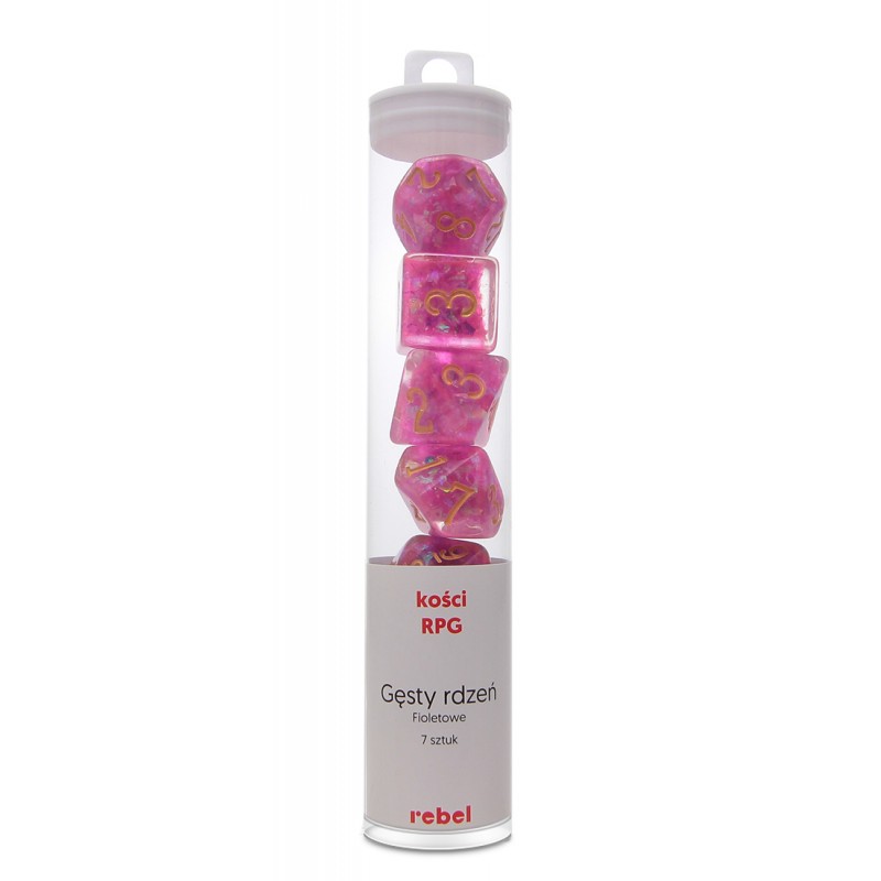 Komplet kości marki Rebel, czyli siedem niezwykle oryginalnych kości w stonowanych kolorach, wzbogaconych o mieniący się brokat, który przepięknie chwyta światło. Niezwykle wysoka jakość odlewu, precyzja żłobienia oraz malowania numerów, czynią z nich podstawowy wybór dla wielu graczy, zarówno początkujących, jak i zaawansowanych.