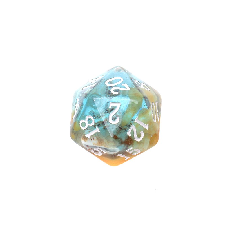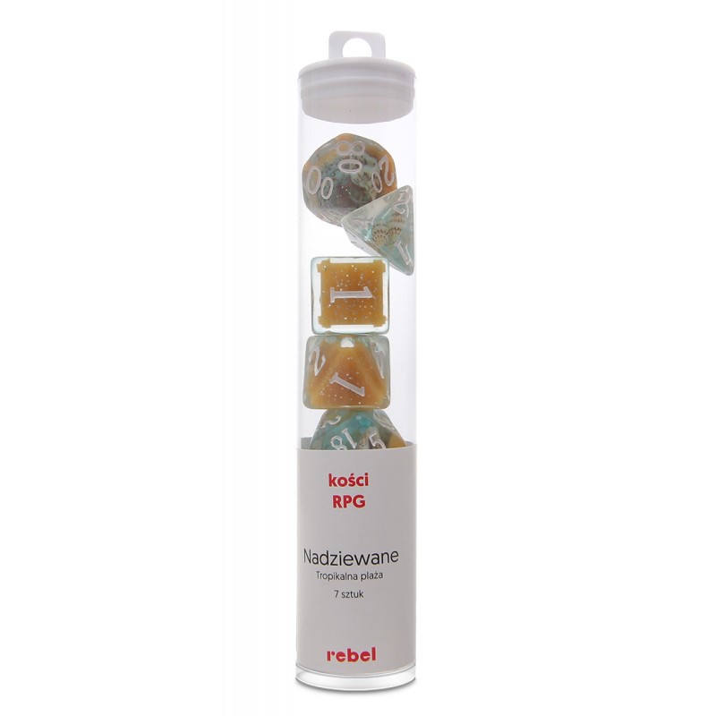Komplet kości REBEL RPG - Nadziewane - Tropikalna plażaKomplet kości marki Rebel, czyli siedem niezwykle oryginalnych kości w stonowanych kolorach, wzbogaconych o mieniący się brokat, który przepięknie chwyta światło.