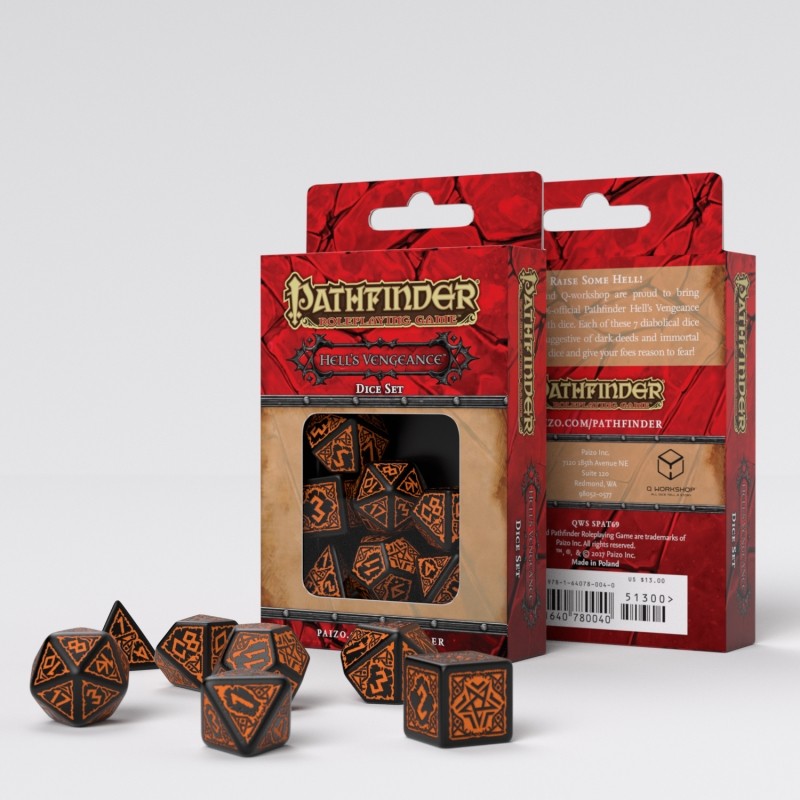 Paizo Publishing oraz Q-workshop przedstawiają zestaw kości inspirowane kampanią Pathfinder: Hell's Vengeance. Te pięknie wykonane kości w kolorze czarnym zdobione pomarańczowymi wzorami posłużą w każdej przygodzie