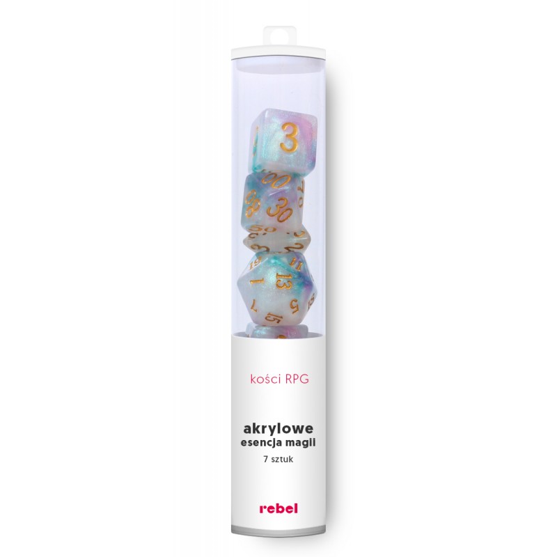 Komplet kości marki Rebel, czyli siedem precyzyjnie wykonanych akrylowych kości do gier fabularnych.