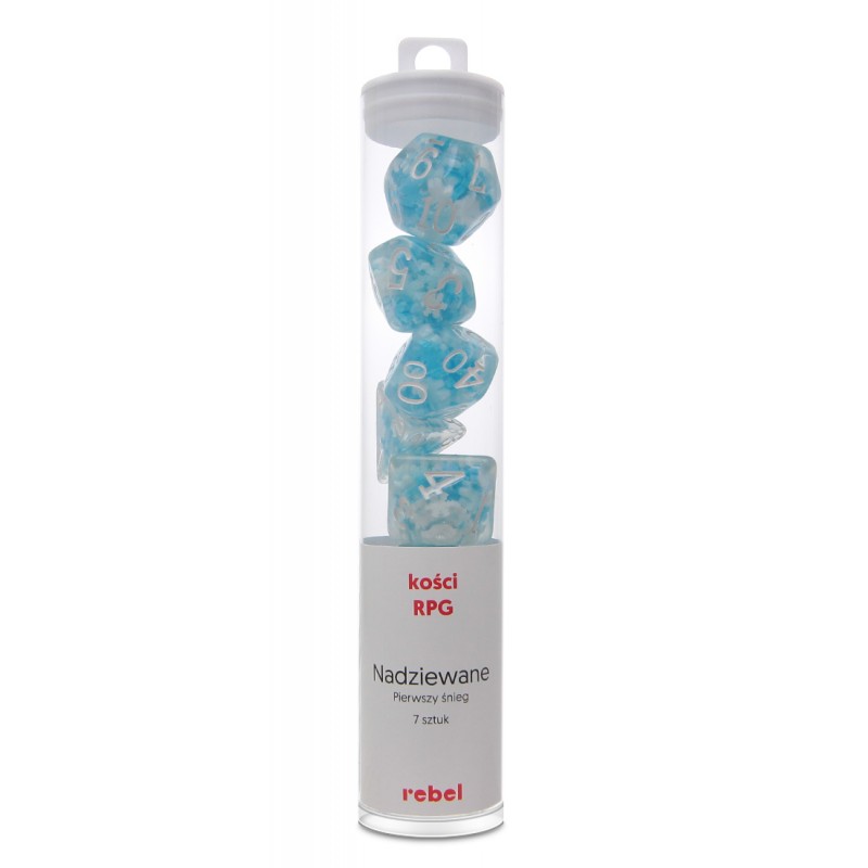 Komplet kości REBEL RPG - Nadziewane - Pierwszy śniegKomplet kości marki Rebel, czyli siedem niezwykle oryginalnych kości w stonowanych kolorach, wzbogaconych o mieniący się brokat, który przepięknie chwyta światło.