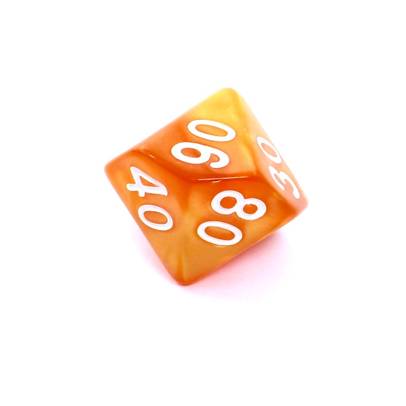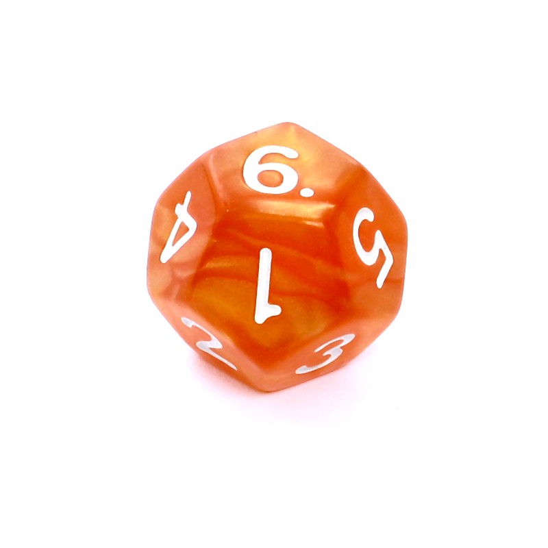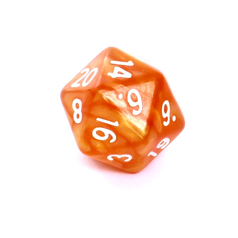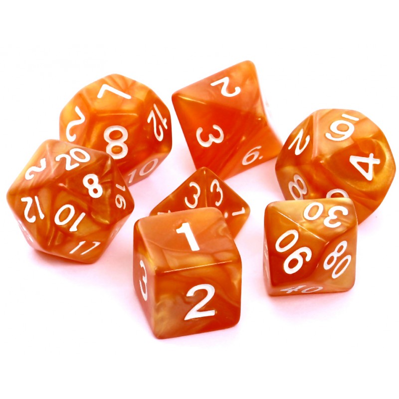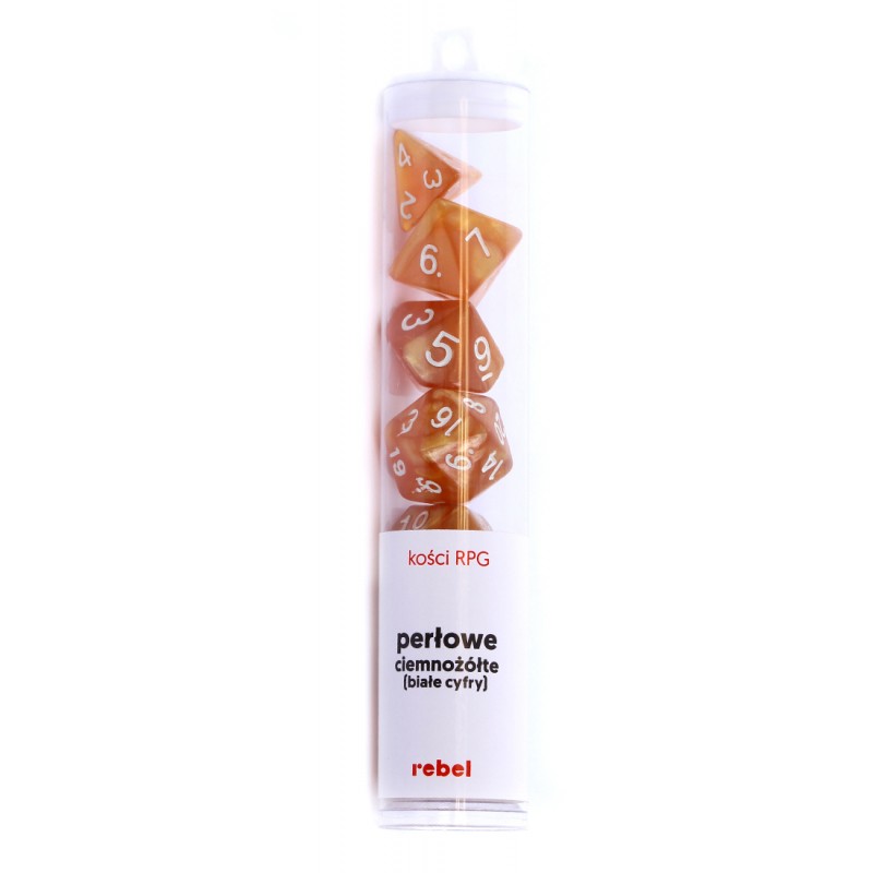 Komplet kości REBEL RPG - Perłowe - Ciemnożółte (białe cyfry)Perłowe kości Rebel są produkowane podobnie jak kości matowe, z tą różnicą, że do tworzywa o jednolitym kolorze dosypywany jest połyskliwy pył, który podczas mieszania nabiera delikatnych, fantazyjnych wzorów.