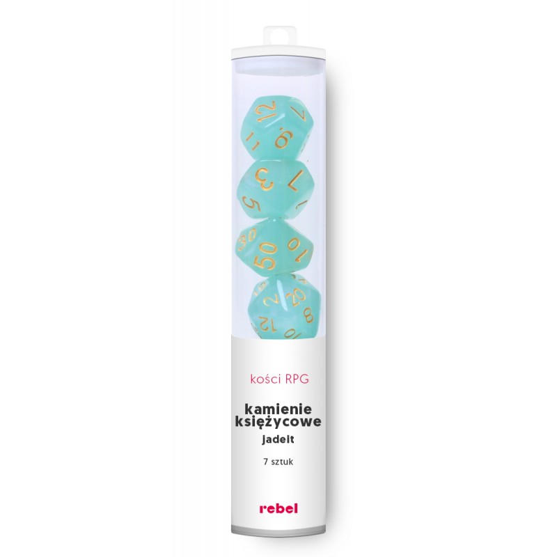 Komplet kości REBEL RPG - Kamienie Księżycowe - Jadeit, czyli siedem niezwykle oryginalnych kości w stonowanych kolorach, wzbogaconych o mieniący się pyłek, który przepięknie chwyta światło.