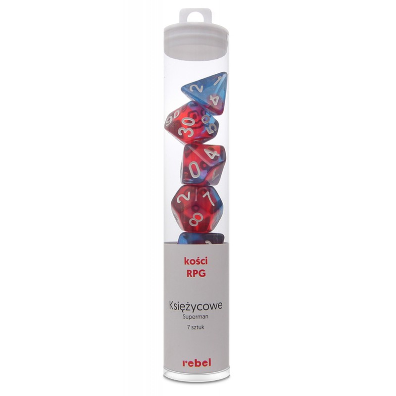 Komplet kości REBEL RPG - Kamienie Księżycowe - SupermanKomplet kości marki Rebel, czyli siedem niezwykle oryginalnych kości w stonowanych kolorach, wzbogaconych o mieniący się pyłek, który przepięknie chwyta światło.