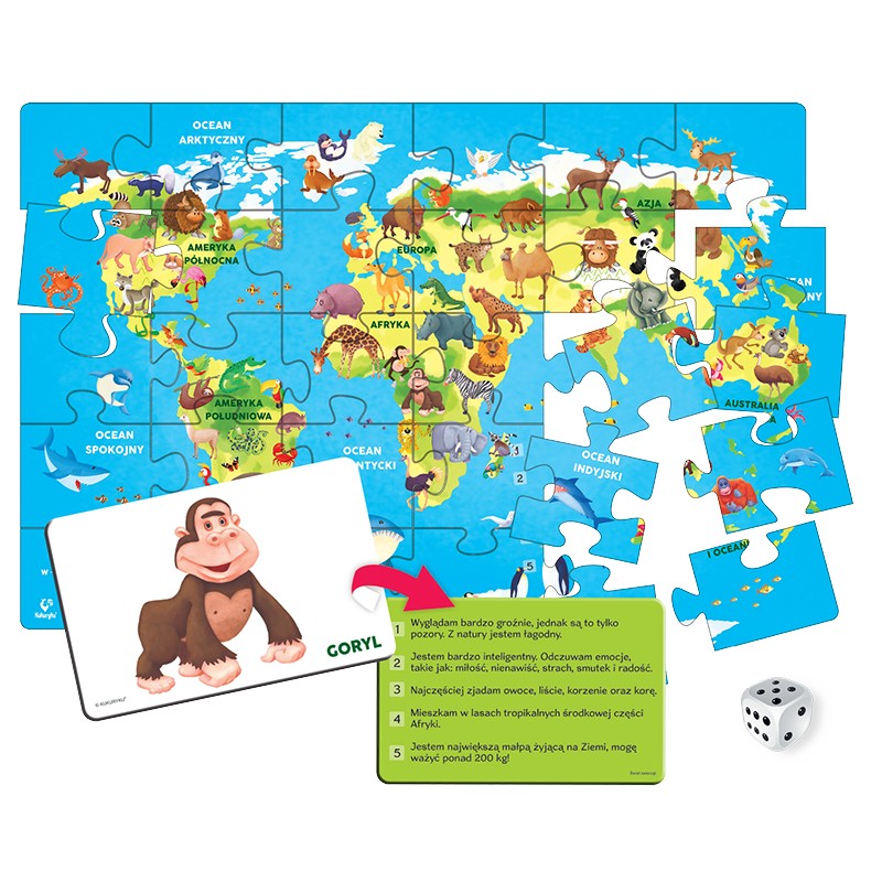 Świat zwierząt to gra w której uczestnicy muszą wykazać się wiedzą o tematyce przyrodniczej. Oprócz odpowiedzi na zagadki, gracze mają do złożenia bajecznie kolorowe puzzle, które tworzą mapę świata ze zwierzątkami.