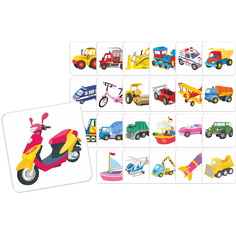 80 kartoników pogrupowanych w pary, mające na jednej stronie takie same obrazki w parze. Jest więc 40 par i 40 różnych obrazków przedstawiających rozmaite pojazdy.