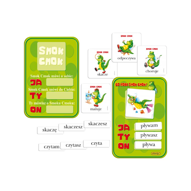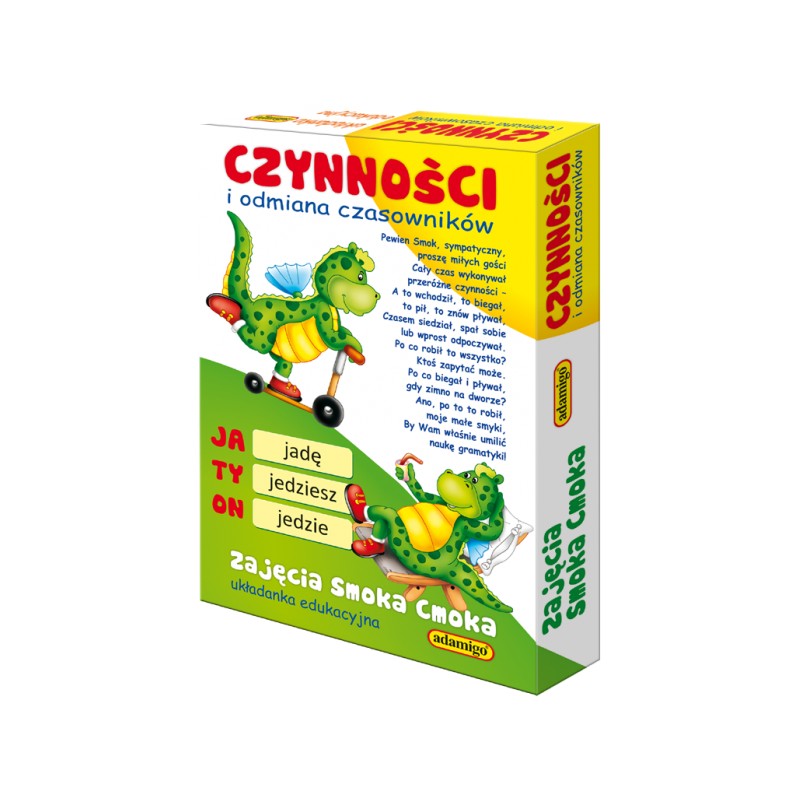 Układanka edukacyjna dla dzieci z klas I-III uczących się odmiany czasowników. Zestaw edukacyjny zawiera dwustronną planszę, 24 duże, dwustronne kartoniki z wierszykami oraz 36 mniejszych kartoników z czasownikami.