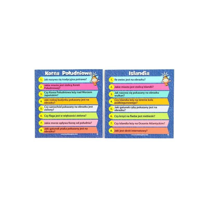 Patrz uważnie na kartę przez 10 sekund. Zapamiętaj kraje, stolice i inne ciekawostki przedstawione na pięknych obrazkach. Odwróć kartę i odpowiedz na wszystkie pytania (odpowiedzi zapisz na kartce papieru). Jeśli odpowiedziałeś poprawnie na wszystkie pytania możesz zatrzymać kartę. Jeśli jakaś odpowiedź jest błędna odkładasz kartę do pudełka. Zobacz ile kart uda Ci się zdobyć w 10 minut.