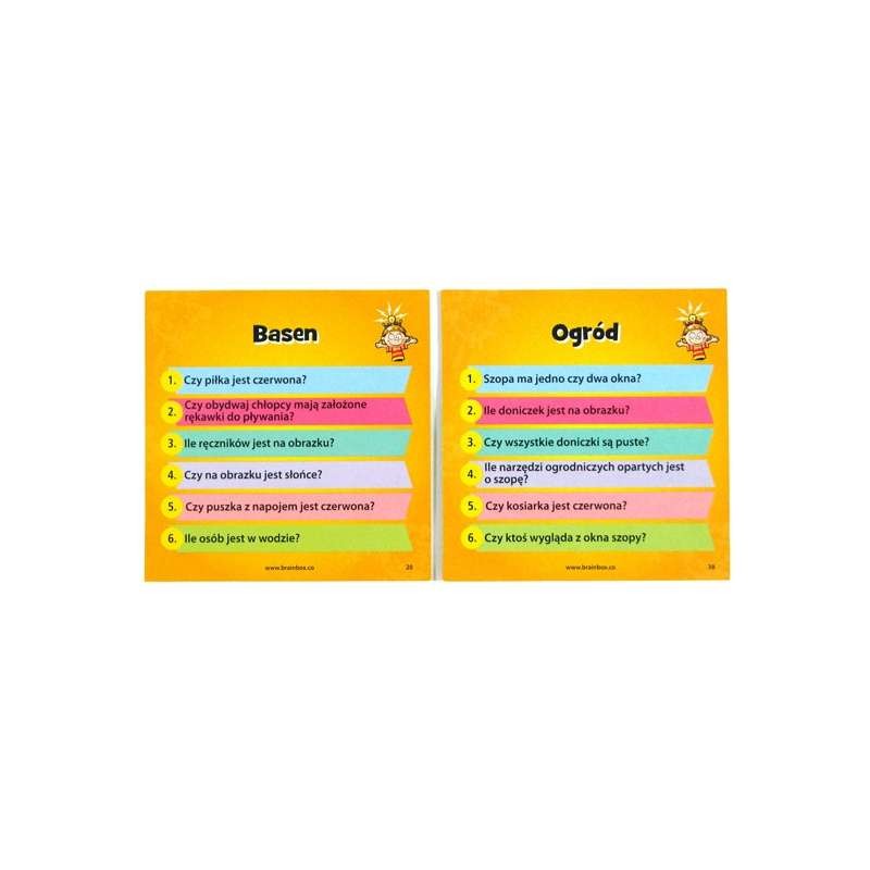Patrz uważnie na kartę przez 10 sekund. Zapamiętaj kolory, kształty i inne szczegóły przedstawione na pięknych obrazkach. Odwróć kartę i odpowiedz na wszystkie pytania (odpowiedzi zapisz na kartce papieru). Jeśli odpowiedziałeś poprawnie na wszystkie pytania możesz zatrzymać kartę. Jeśli jakaś odpowiedź jest błędna odkładasz kartę do pudełka. Zobacz ile kart uda Ci się zdobyć w 10 minut.