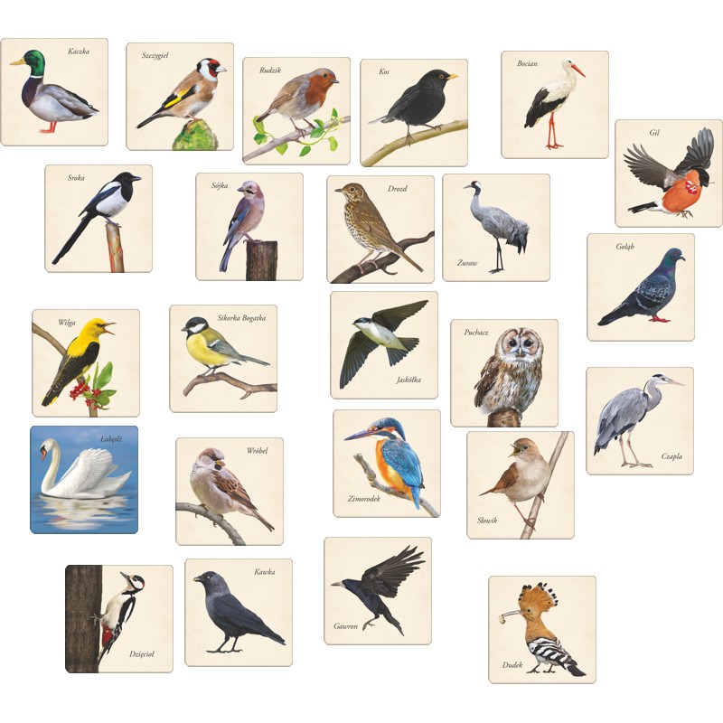 Pudełko zawiera 48 sztuk twardych tafelków, na których znajdują się 24 pary pięknych ilustracji z ptakami Polski. Więc... odkryj ich piękno grając w memory adamigo.