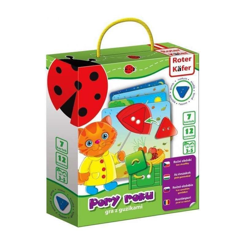 W tej grze dziecko dowiaduje się ciekawostek o porach roku, nauczy się podstawowych kolorów oraz figur geometrycznych. Przywiąż różnokolorowe guziki do kartek na podobne według formy przedmioty.