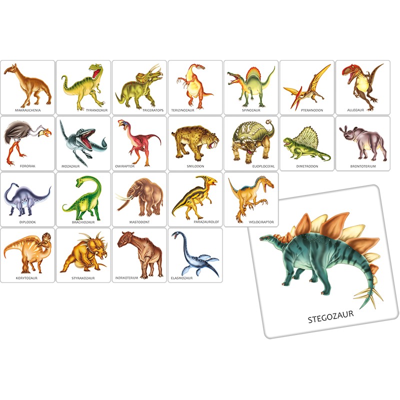 Zestaw zawiera 48 kartoników pogrupowanych w pary. Na obrazkach znajdują się 24 dinozaury i inne prehistoryczne potwory, wśród nich: tyranozaur, triceratops, diplodok a także smilodon.