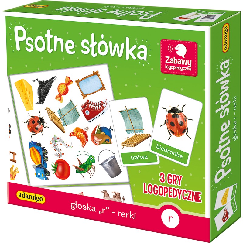 Seria gier PSOTNE SŁÓWKA przeznaczona jest dla wszystkich, którzy chcą doskonalić prawidłową wymowę trudnych głosek. Psotne polskie słowa często sprawiają najmłodszym wiele trudności. Dzięki grze ćwiczenia logopedyczne staną się przyjemnością.