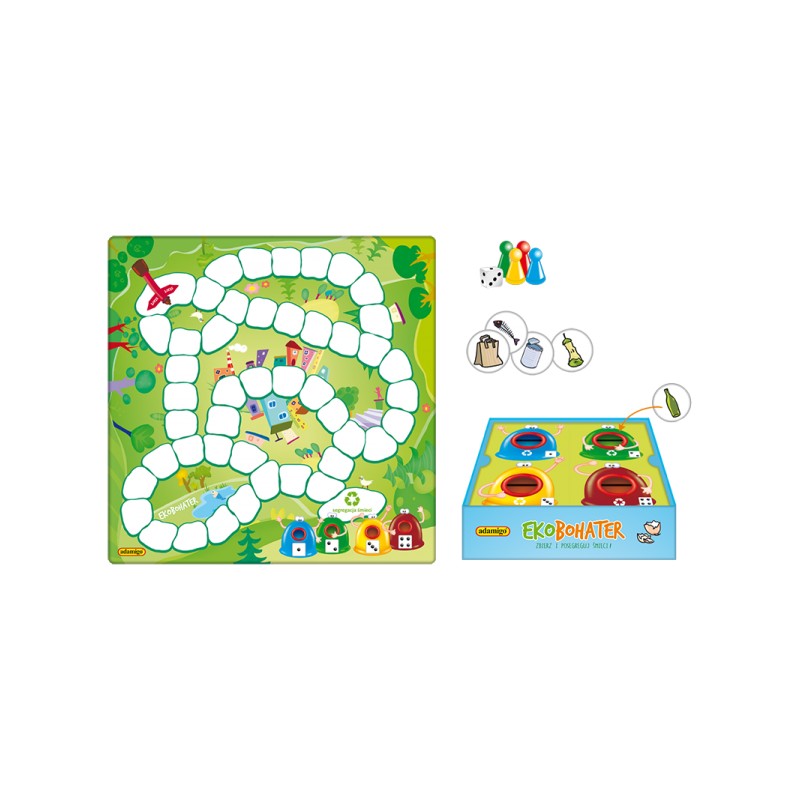 EKOBOHATER to gra, która zapewni całej rodzinie świetną zabawę i zachęci do dbania o środowisko! Zadaniem graczy jest zebranie z planszy różnego rodzaju śmieci np.: puszek, starych gazet, butelek, plastikowych opakowań.