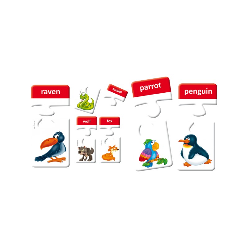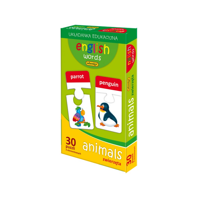 Zestaw dwuelementowych puzzli, składający się aż z 60 elementów. Podczas układania dzieci w naturalny sposób zapoznają się z zapisem angielskich słówek.