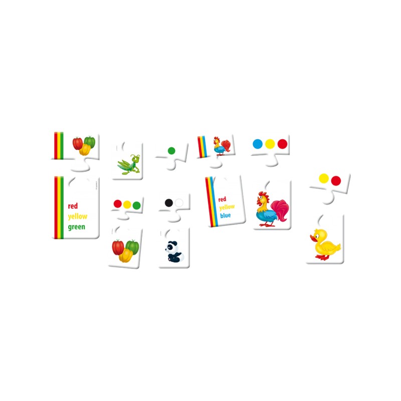 Zestaw dwuelementowych puzzli, składający się aż z 60 elementów. Podczas układania dzieci w naturalny sposób zapoznają się z zapisem angielskich słówek. Zestaw edukacyjny świetnie sprawdza się zarówno podczas samodzielnej zabawy jak i w dużej grupie.