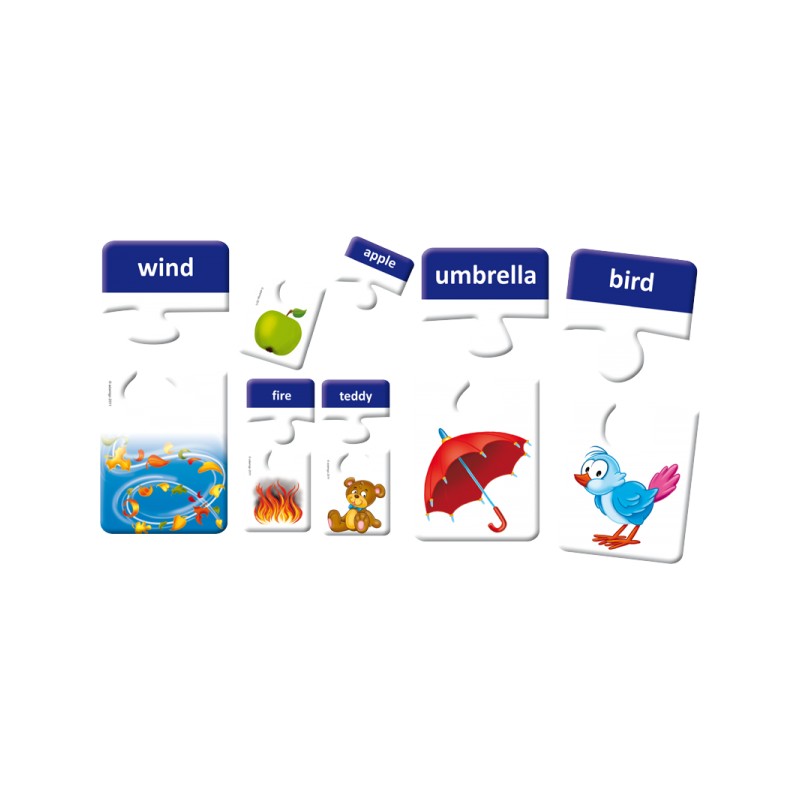 Zestaw dwuelementowych puzzli, składający się aż z 60 elementów. Podczas układania dzieci w naturalny sposób zapoznają się z zapisem angielskich słówek. Zestaw edukacyjny świetnie sprawdza się zarówno podczas samodzielnej zabawy jak i w dużej grupie.