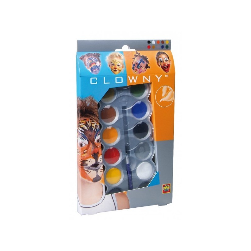 Zestaw CLOWNY składa się z dziesięciu farbek po 3g w kolorach: złotym, zielonym, brązowym, niebieskim, pomarańczowym, czarnym, czerownym, srebrnym, żółtym, białym oraz pędzelka.