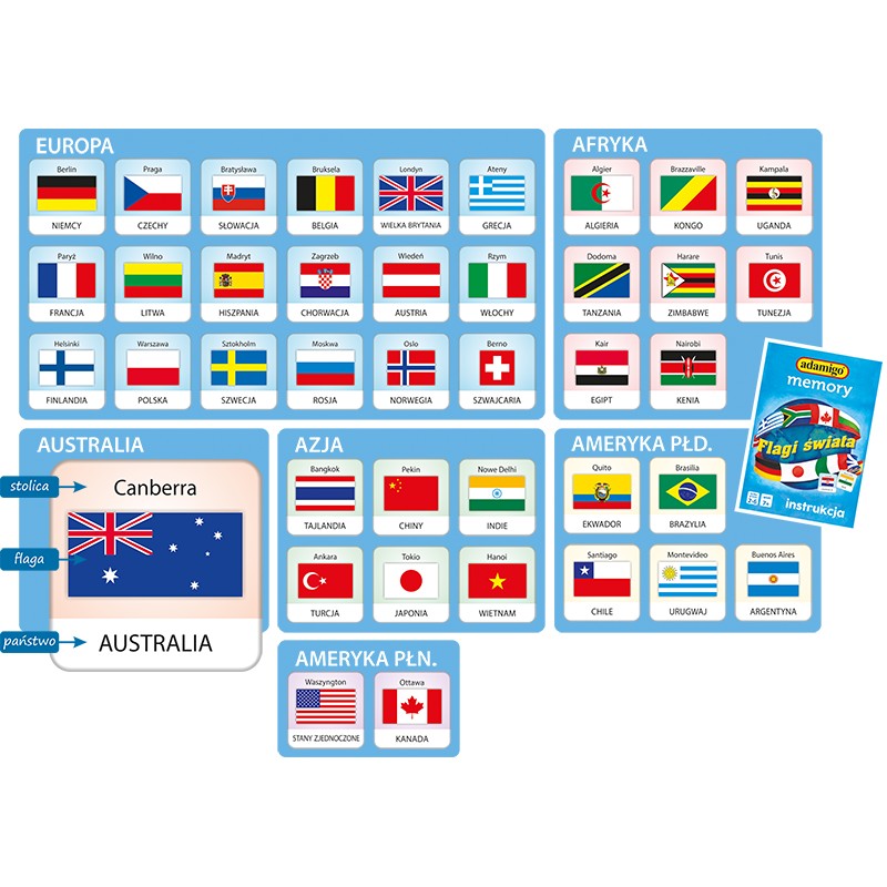 Gra ADAMIGO MEMORY jest doskonałą grą towarzyską dla wszystkich lubiących dobrą zabawę w wesołym klimacie. Rozwija pamięć, uczy koncentracji, zbliża rodzinę i uprzyjemnia wolne chwile. Tym razem młody gracz ma okazję zapoznać się z wyglądem aż 40 flag różnych państw z całego świata.
