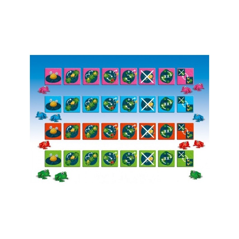 W głębokim stawie, gęsto porośniętym liśćmi lilii wodnych, żyje stado kolorowych żab. Od czasu do czasu żabki urządzają wyścigi. Po drodze czyhają jednak przeróżne niespodzianki i niebezpieczeństwa. Czasem z głębin wynurzy się nawet zębata paszcza podwodnego potwora!
