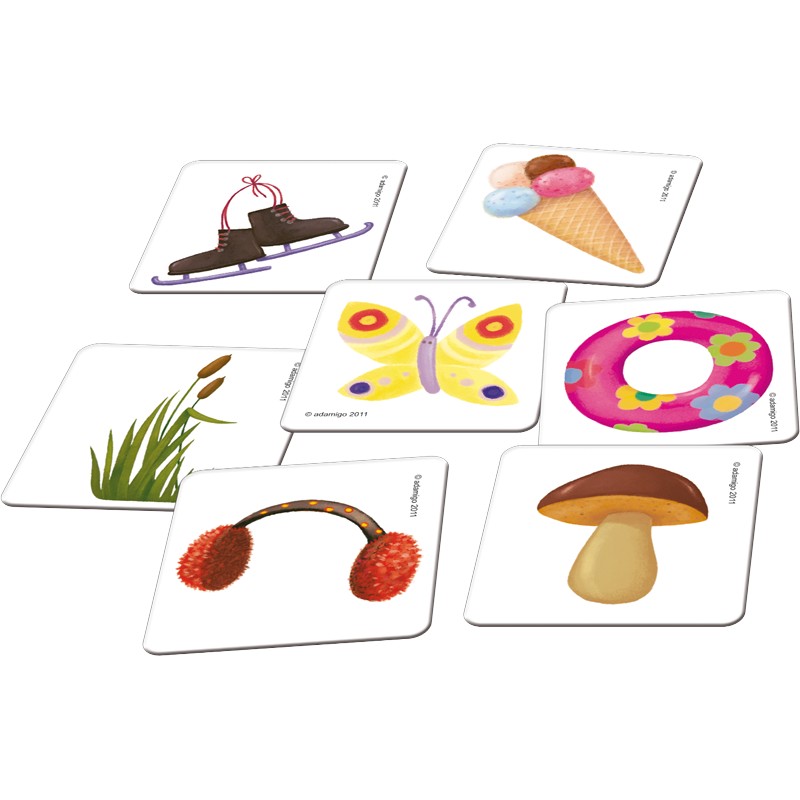 Loteryjka edukacyjna zawiera 3 gry, uczy spostrzegawczości, analizowania obrazu i kojarzenia sytuacyjnego. Piękne ilustracje zachęcają do opowiadania: co takiego, o tej porze roku, robią dzieci na obrazku. Gra zawiera 4 dwustronne plansze, 35 tafelków oraz instrukcję gier.