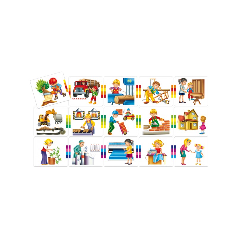W zestawie znajduje się 15 plakietek z rysunkami 3 cykli produkcyjnych. Aby ułożyć pięć plakietek w proces produkcyjny, trzeba najpierw zadać trochę pytań dorosłym. Sprawdzisz sam, czy ułożyłeś właściwie, dzięki barwnym znakom na bokach plakietek. Powodzenia.