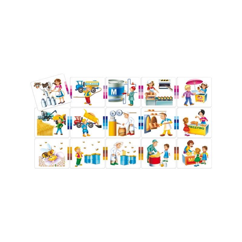 Zestaw zawiera 15 plakietek z rysunkami 3 cykli produkcyjnych. Aby ułożyć prawidłowo 5 plakietek w proces produkcyjny, trzeba o tym porozmawiać z mamą, tatą albo dziadkiem. Sprawdzisz sam, czy ułożyłeś właściwie dzięki barwnym znakom na bokach plakietek. Powodzenia.