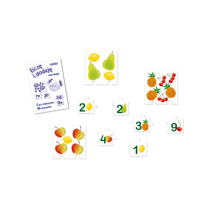 Układanka „Liczę i dodaję” składa się z 48 puzzli, z których można ułożyć 16 kompletów. Na każdy z nich składa się duży puzzel z obrazkiem dwóch rodzajów owoców oraz dwa mniejsze z cyframi i owocami, które odpowiadają liczbie owoców z dużego puzzla. W środku pudełka znajduje się instrukcja z opisem dwóch gier.
