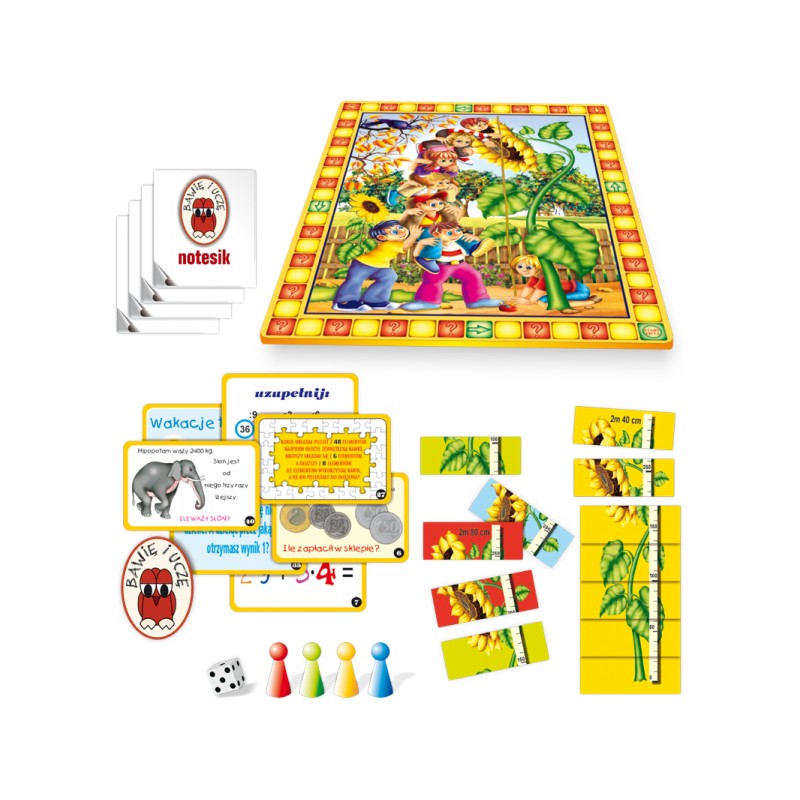 Ciekawa forma gry pomaga dziecku rozwiązać pierwsze matematyczne problemy. Zestaw składa się między innymi z kolorowej planszy, 50-u kart z pytaniami i zadaniami z zakresu od II do V klasy szkoły podstawowej.