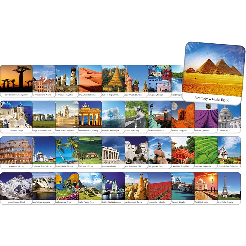 Pudełko zawiera 80 sztuk twardych tafelków, na których znajduje się 40 par zdjęć z najbardziej znanych zakątków pięknego świata.