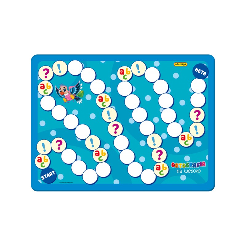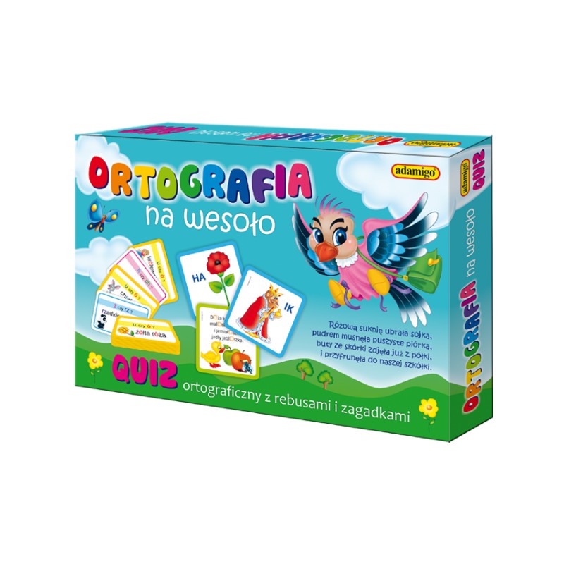 Quiz „Ortografia na wesoło” zawiera aż 54 karty z pułapkami ortograficznymi wraz z odpowiedziami, planszę, 24 kartoniki z wierszami i zagadkami, pionki oraz kostkę do gry.