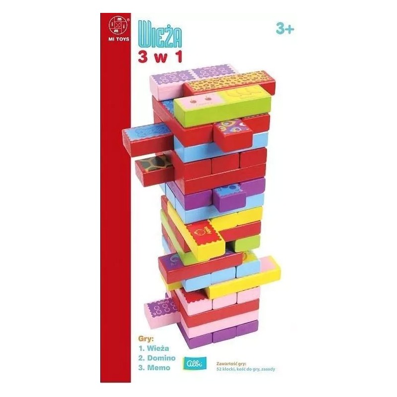 Wieża - 3w1 to zestaw kolorowych drewnianych klocków, przy których zabawa nie ma końca!Zawartość pudełka możemy użyć przynajmniej na trzy sposoby: jako domino, memory lub Jengę.