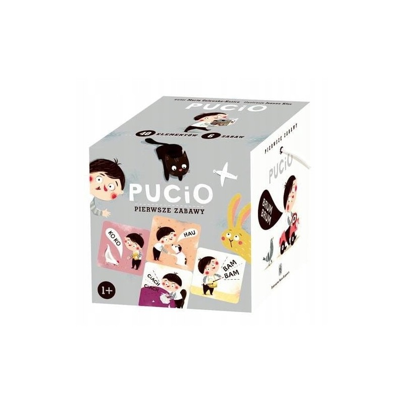 Zestaw składa się z 32 obrazków. Na kartonikach znajdują się obrazki z wyrażeniem dźwiękonaśladowczym, a także obiektem lub zwierzęciem wydającym dany dźwięk oraz wizerunkiem Pucia – ulubionego bohatera maluchów. Wyrażenia dźwiękonaśladowcze są wypowiadane już przez roczne dzieci i stanowią bardzo istotny element rozwoju mowy. Zebrane w estetycznym pudełku obrazki dają okazję do rozmaitych zabaw, w zależności od możliwości intelektualnych i potrzeb dziecka: nauki nazywania obiektów, powtarzania i rozpoznawania wyrażeń dźwiękonaśladowczych, wyszukiwania wskazanych przez rodziców obiektów spośród kilku wybranych kartoników i wielu innych gier (opisanych w dołączonej do zestawu instrukcji).