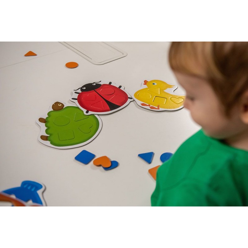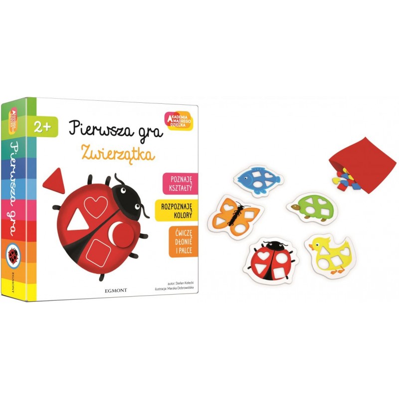 Zanim rozpoczniesz z dzieckiem grę, pokaż mu jej elementy i omów nazwy zwierząt (biedronka, rybka, żółw, motyl, kaczuszka) i kolory jakie mają. Porozmawiaj z dzieckiem o figurach i kształtach. Nazwij je i podotykajcie je wspólnie.