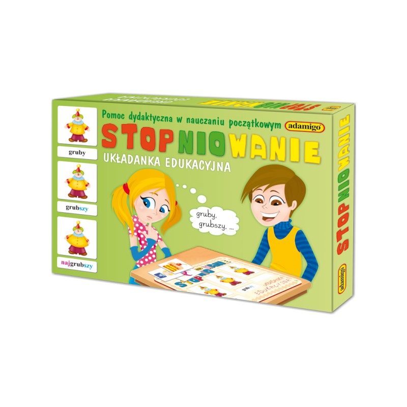 UKŁADANKA EDUKACYJNA przeznaczona dla starszych przedszkolaków i dzieci z klas początkowych szkół podstawowych. Układanka zawiera 48 rysunków, które ilustrują 16 zestawów przymiotników w stopniu równym, wyższym i najwyższym.