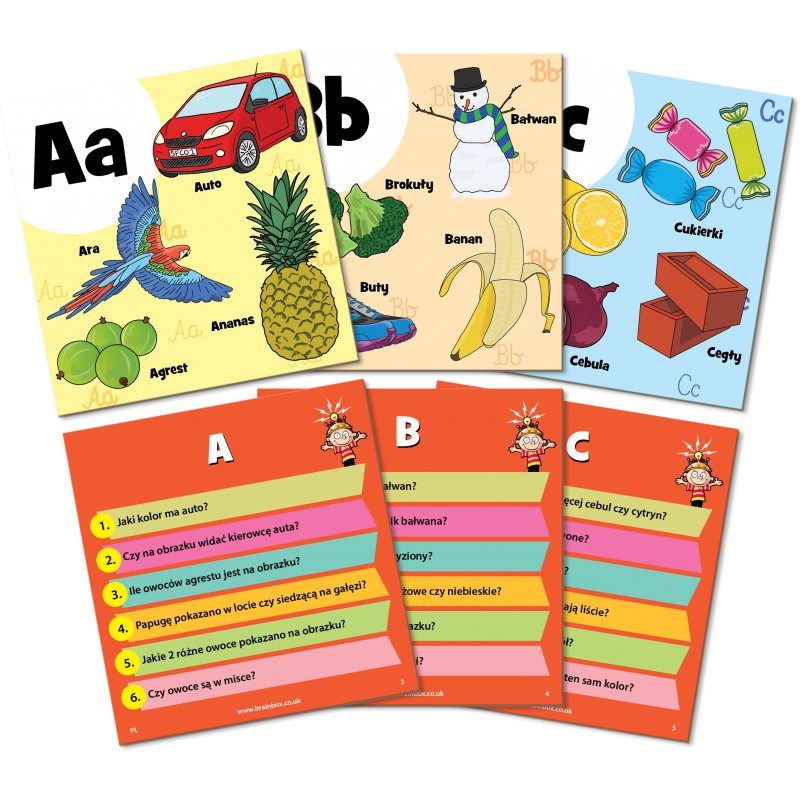 Szukasz narzędzia, które połączy dobrą naukę z poznawaniem alfabetu i poszerzaniem słownictwa? BrainBox - ABC to coś dla Ciebie! Na 55 kartach znajdziesz nie tylko słowa zaczynające się na daną literę i odpowiadające im obrazki, ale również zestaw pytań, które pozwolą ćwiczyć zapamiętywanie, proste liczenie oraz spostrzegawczość.