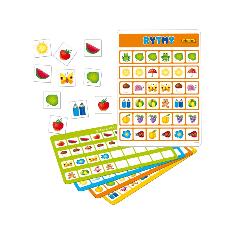 Należy dokończyć na planszy szlaczki wg wzoru. Zabawa może być bardziej kreatywna: układanie szlaczków według własnego pomysłu. Możliwości są nieograniczone: można tworzyć sekwencje powtarzających się 2, 3, 4 lub wielu elementów, układając długie wzory na stole lub podłodze. Druga strona plansz zawiera propozycje rytmów. Zadaniem gracza jest odnalezienie algorytmu i odtworzenie poprawnego ciągu obrazków na stole. Ćwiczenia wyrabiają spostrzegawczość i zdolności przyporządkowania liniowego, zachęcają do kreatywności oraz logicznego myślenia.
