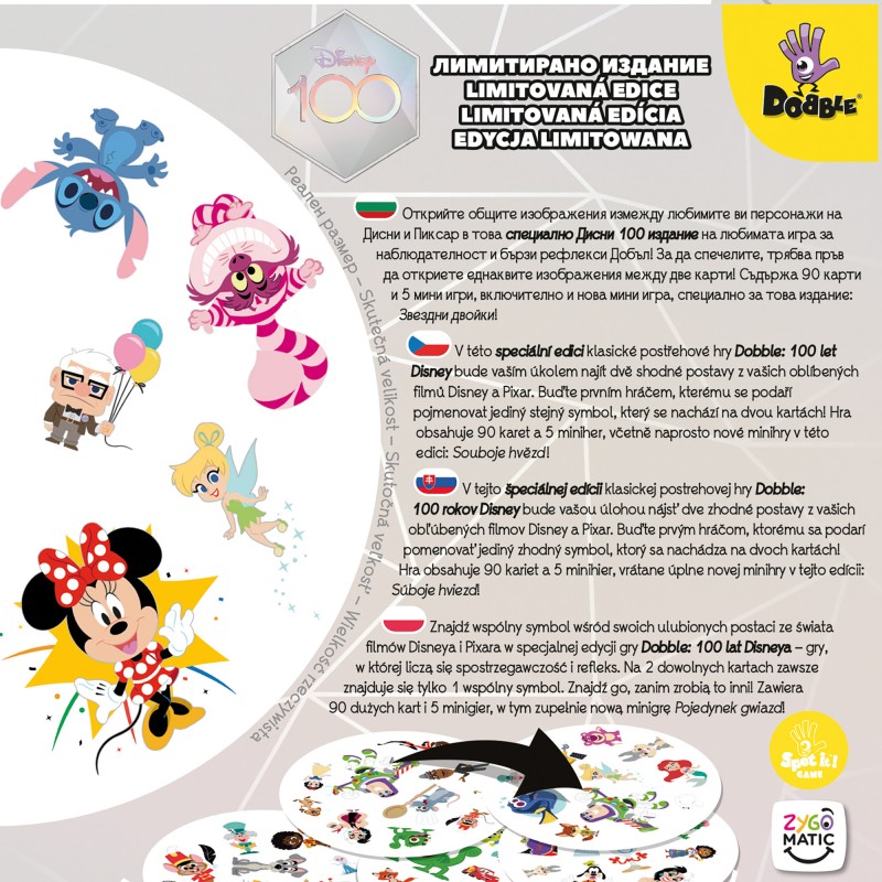 - Dzięki nawiązaniu do popularnych animacji, Dobble 100 lat Disneya świetnie sprawdzą się nie tylko jako gra dla najmłodszych, ale też jako prezent dla dorosłych fanów bajek. Grafiki przedstawiają najpopularniejsze postacie i będą świetną okazją do przypomnienia sobie ulubionych opowieści.
