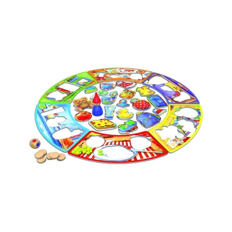 W pudełku znajdziecie planszę składającą się z 6 części, 18 przedmiotów o najróżniejszych kształtach, figurkę Tomcia, 6 dysków, kolorową kostę oraz instrukcję.