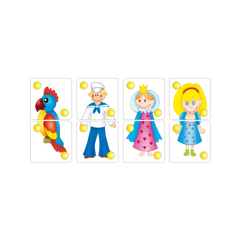 Kolejnym zadaniem dziecka jest nazwanie powstałego z połączenia dwóch części obrazu. Gra pomaga rozwinąć zakres słownictwa dziecka, a także rozwija jego zdolności manualne. Układanka składa się z 24 kolorowych obrazków znajdujących się na plakietkach z otworami, które dziecko musi umieścić w pudełku z plastikowymi bolcami.