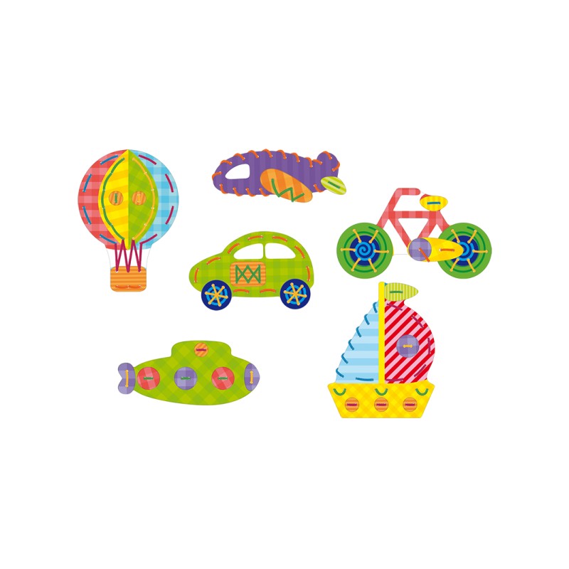 Zestaw do kreatywnej zabawy doskonalący sprawność manualną najmłodszych. Dzieci mogą swobodnie łączyć ze sobą poszczególne elementy zestawu bądź ubarwiać pojedyncze przez przewlekanie i przeplatanie kolorowych sznurowadeł.