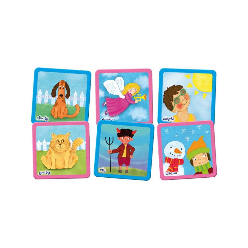 Zadaniem uczestników zabawy jest odnalezienie, a później nazwanie 24 przeciwieństw. W środku pudełka znajduje się instrukcja z opisem czterech emocjonujących gier, w które można grać zarówno w gronie rodzinnym jak i przedszkolu.