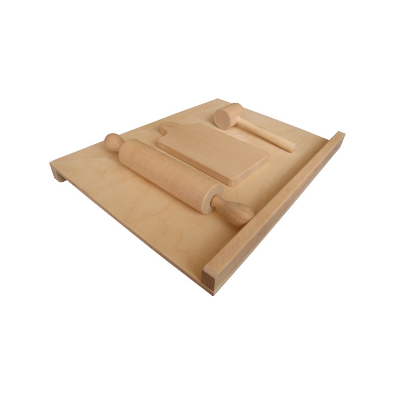 Komplet składający się z drewnianej stolnicy, wałka, deski oraz tłuczka zachęca do czynnego poznawania zajęć wykonywanych w gospodarstwie domowym. Wszystko w dostosowanym do dziecka mniejszym rozmiarze.