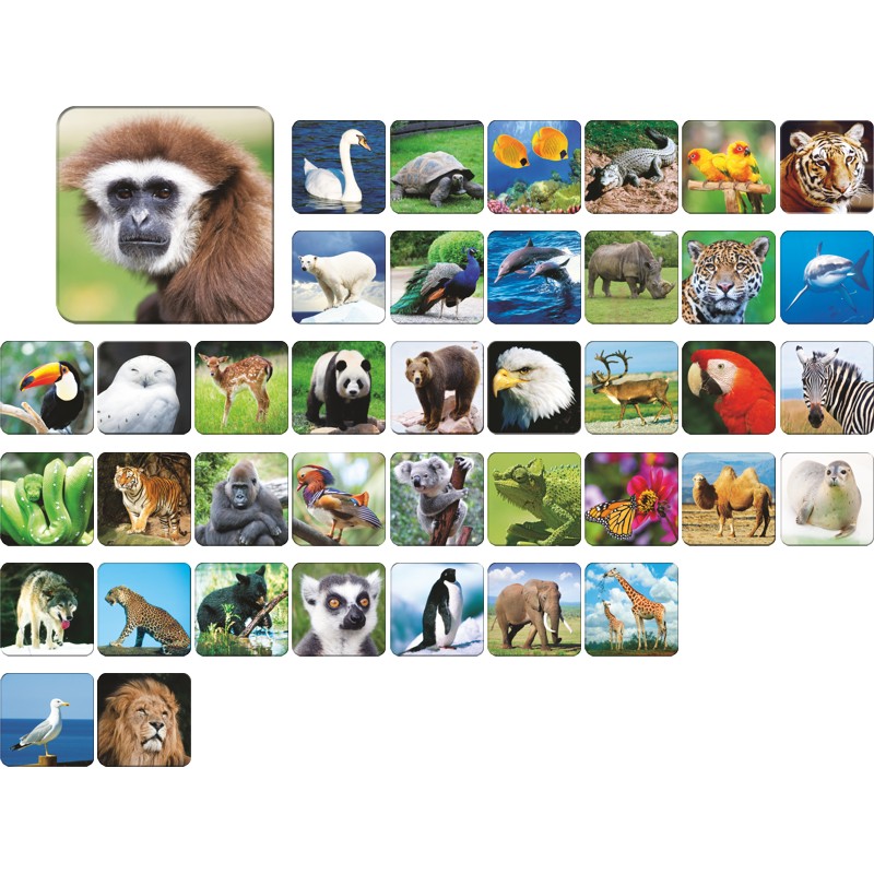 80 kartoników pogrupowanych w pary, mające na jednej stronie takie same obrazki w parze. Jest więc 40 par i 40 różnych fotografii zwierząt z całego świata.